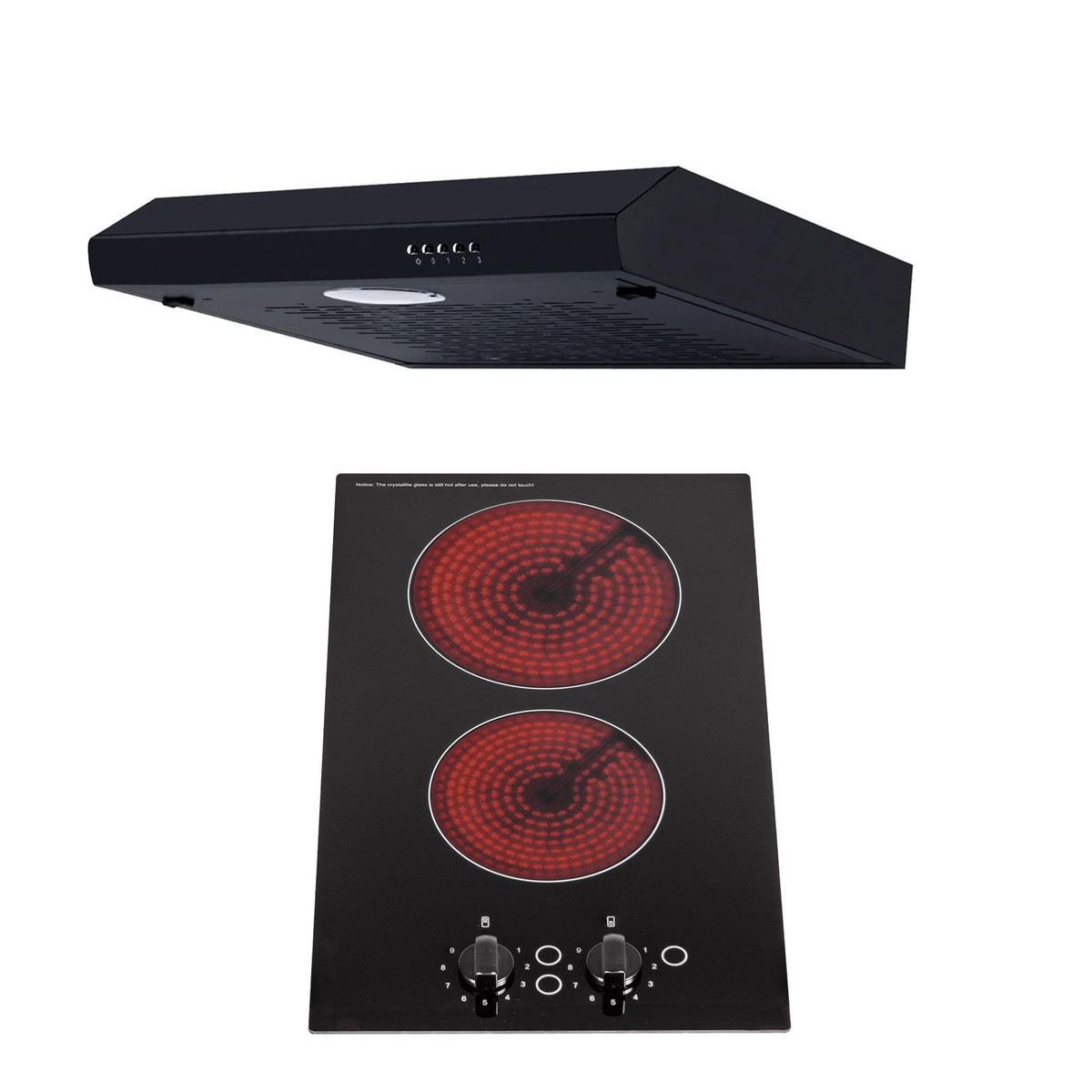 The CERH30BL-STH60BL package consists of a black 30cm domino ceramic hob and a 60cm slimline visor cooker hood. With 2 cooking zones of 2 different sizes, front mounted controls and 9 power levels, the hob has everything you need to cook your meals effortlessly. The cooker hood is small in design but powerful, helping you to keep your kitchen clean and fresh whilst maintaining a minimalist look. This set is perfect for those looking for high quality appliances to fit into a small space, such as student accommodation or caravans.