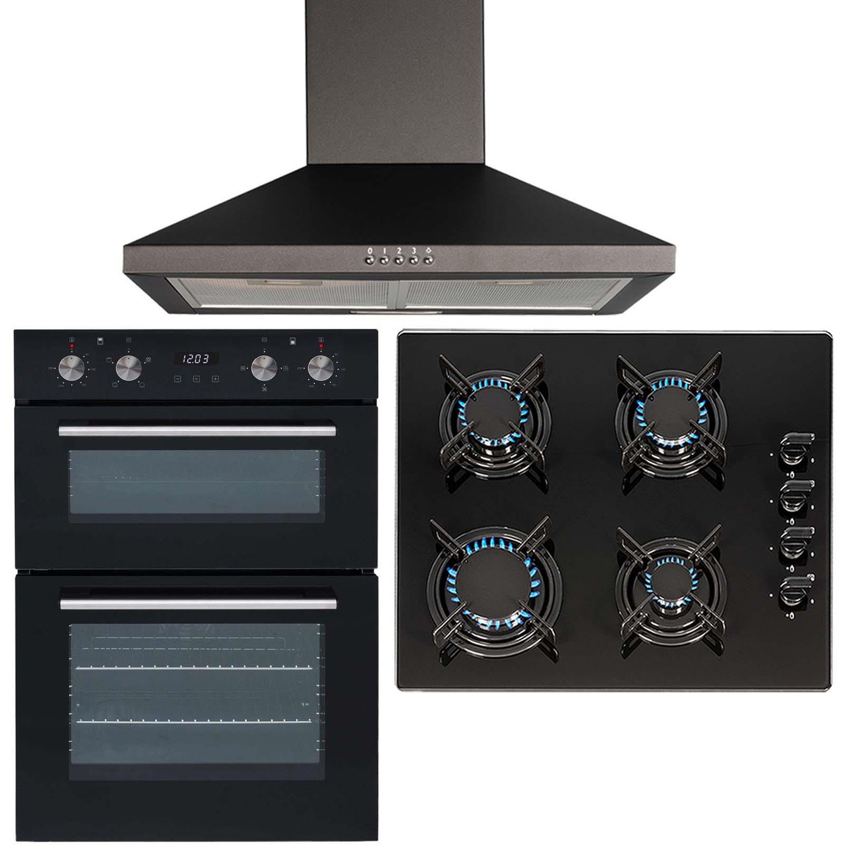 The DO102-GHG612BL-CHL60BL pack contains a double true fan electric oven, 4 burner gas hob and a 60cm black chimney cooker hood. The oven is a stylish yet functional, built-in double oven. With a modern black glass front and stainless steel accessories it will blend in with any kitchens décor. With built-in safety features such as the flame failure safety device and an elegant design, the stunning hob with black safety glass is not only extremely durable and tough but also adds a modern look to any kitchen. The cooker hood is small but powerful helping you keep your kitchen clean and fresh and has a simplistic design that will fit in with your kitchens décor.