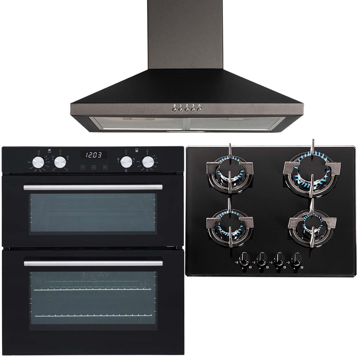 The DO101-GHG603BL-CHL60BL pack is a stylish double electric oven, a 4 burner gas hob and a pyramid chimney cooker hood combination that would look great in any kitchen. Modern black glass gives the oven a wonderful finish which complements the other appliances nicely. The sleek chimney cooker hood has an LED downlight to help light up the gas hob, which comes with 4 powerful burners and removable heavy duty cast iron supports.