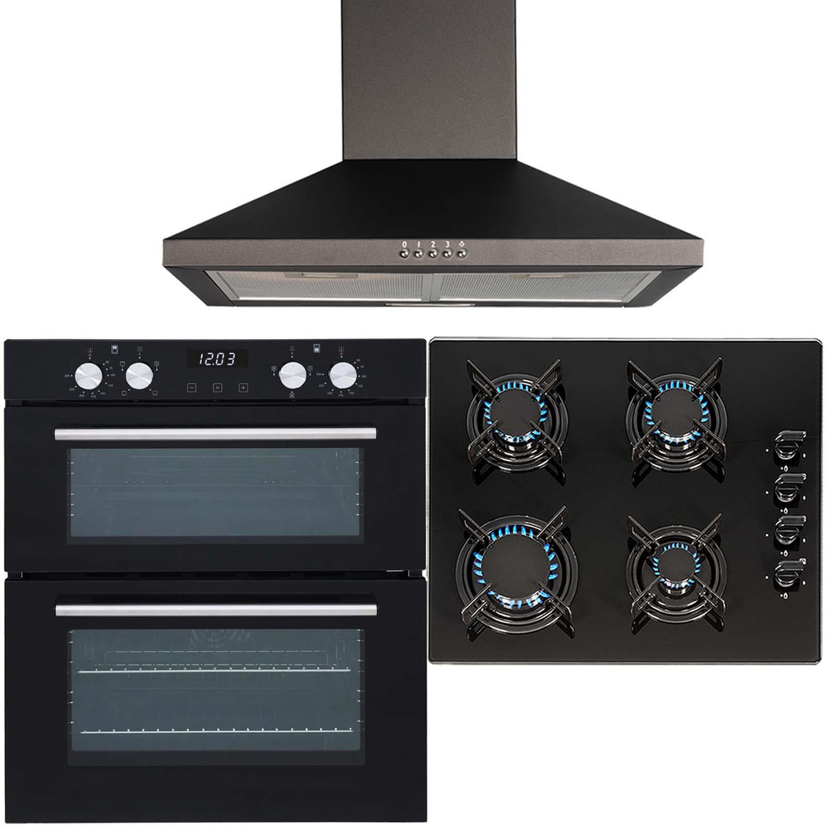 The DO101-GHG612BL-CHL60BL package includes a double electric oven, 4 burner black gas on glass hob and to match, a 60cm pyramid chimney cooker hood. The oven is a stylish yet functional, built-under double oven. With a modern black glass front and stainless steel accessories it will blend in with any kitchens décor. With built-in safety features such as the flame failure safety device and an elegant design, the stunning hob with black safety glass is not only extremely durable and tough but also adds a modern look to any kitchen. The cooker hood is small but powerful helping you keep your kitchen clean and fresh and has a simplistic design that will fit in with your kitchens décor.