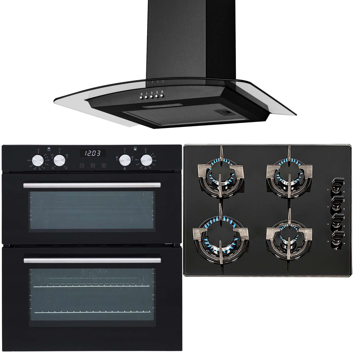 The SIA DO101-GHG602BL-CGH60BL pack includes a double electric fan oven, 4 burner black glass hob and a curved glass cooker hood. The oven has 4 easy-to-use dials to control the function, temperature and buttons for the timer making it simple and quick to use. The hob has built-in safety features and an elegant design, the stunning black safety glass is not only extremely durable and tough but also adds a modern look to any kitchen. The cooker hood is small yet powerful helping you keep your kitchen clean and fresh and has a simplistic design that will fit in with your kitchens décor.