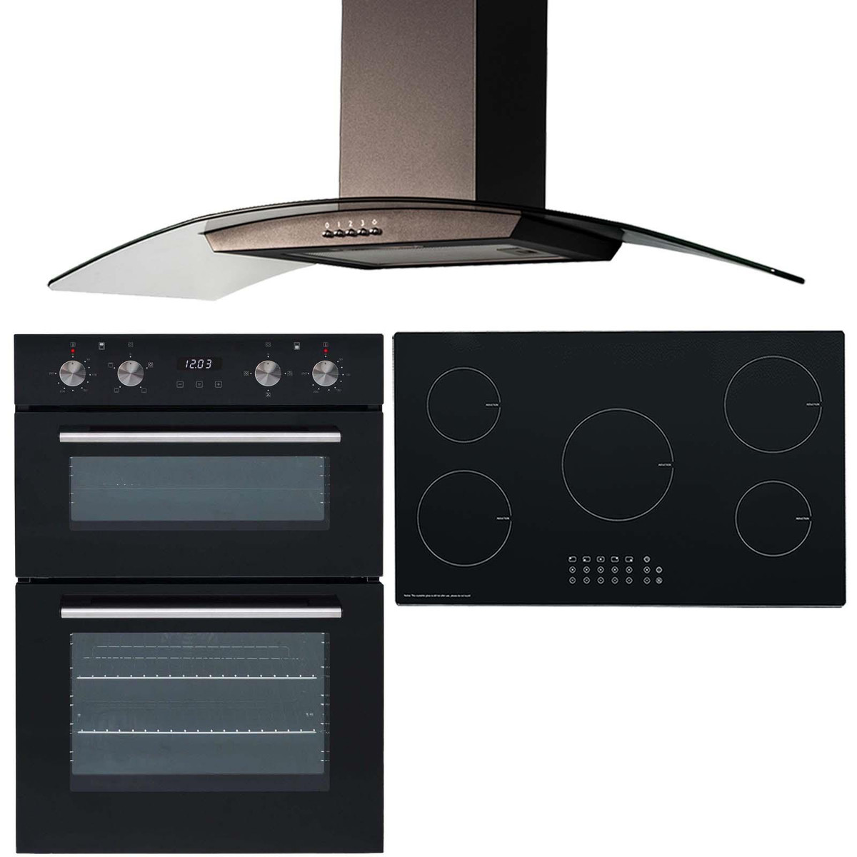 The DO102-INDH90BL-CGH90BL super saver package combines a 60cm double electric oven with a 90cm 5 zone induction hob and a curved glass cooker hood. The oven has an 'A' energy rating to help keep your electrical bills low and has an attractive black glass finish with stainless steel trim. Being built-in means this oven is installed at eye level which makes it easier getting food in and out. The 5 zone induction hob comes with built-in safety features and has plenty of space for all of your cooking needs. The hood has an elegant curved glass design that will add a modern look to any kitchen. The button controls are located on the bottom of the appliance for easy access and it comes with a LED downlight to help illuminate the hob.