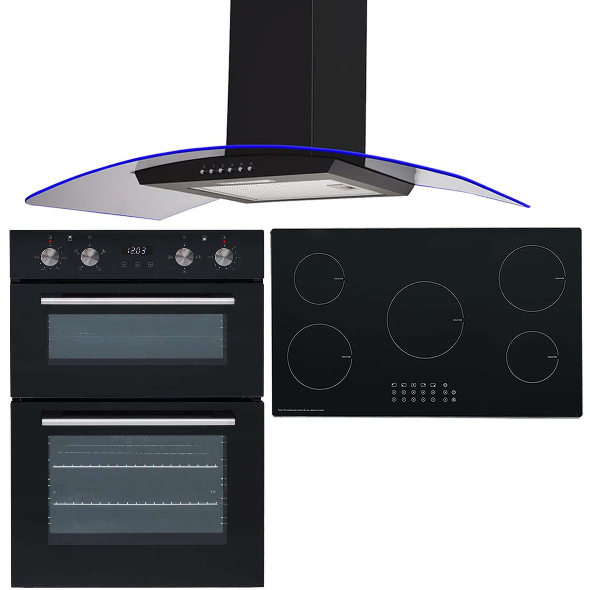 The DO102-INDH90BL-CPLE90BL super saver package combines a 60cm double electric oven with a 90cm 5 zone induction hob and a curved glass angled cooker hood. The oven has an 'A' energy rating to help keep your electrical bills low and has an attractive black glass finish with stainless steel trim. Being built-in means this oven is installed at eye level which makes it easier getting food in and out. The 5 zone induction hob comes with built-in safety features and has plenty of space for all of your cooking needs. The 5 zone induction hob comes with built-in safety features and has plenty of space for all of your cooking needs. The CPLE90BL comes with red, blue and green LED edge lighting that helps you set the perfect ambiance with every use.