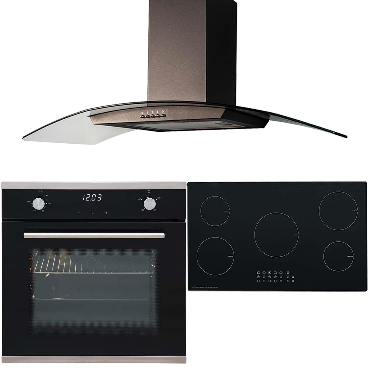 The SO103-INDH90BL-CGH90BL super saver package combines a 60cm single electric touch control oven with a 90cm 5 zone induction hob and an curved glass cooker hood. The single oven has an 'A' energy rating to help keep your electrical bills low and has an attractive black glass finish with stainless steel trim. The 5 zone induction hob comes with built-in safety features and has plenty of space for all of your cooking needs. The hood has an elegant curved glass design that will add a modern look to any kitchen. The button controls are located on the bottom of the appliance for easy access and it comes with a LED downlight to help illuminate the hob.