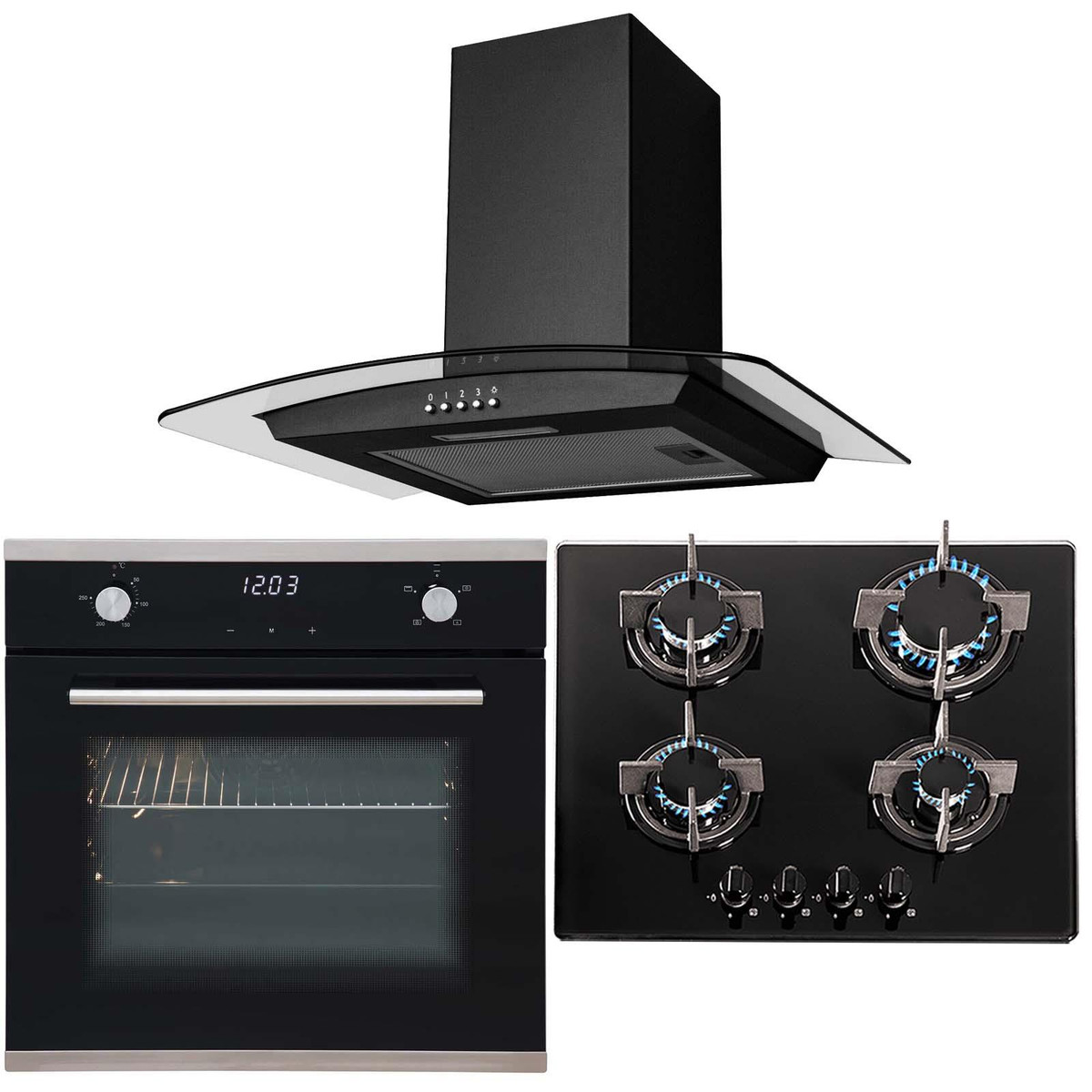 The SIA SO103-GHG603BL-CGH60BL saver pack consists of a single touch control electric fan oven, 4 burner black gas hob and a curved glass extractor fan. The oven has 2 easy-to-use dials to control the function and temperature, with separate soft touch controls to operate the timer. The hob has built-in safety features and an elegant design, the stunning black safety glass is not only extremely durable and tough but also adds a modern look to any kitchen. The cooker hood is small yet powerful helping you keep your kitchen clean and fresh and has a simplistic design that will fit in with your kitchens décor.