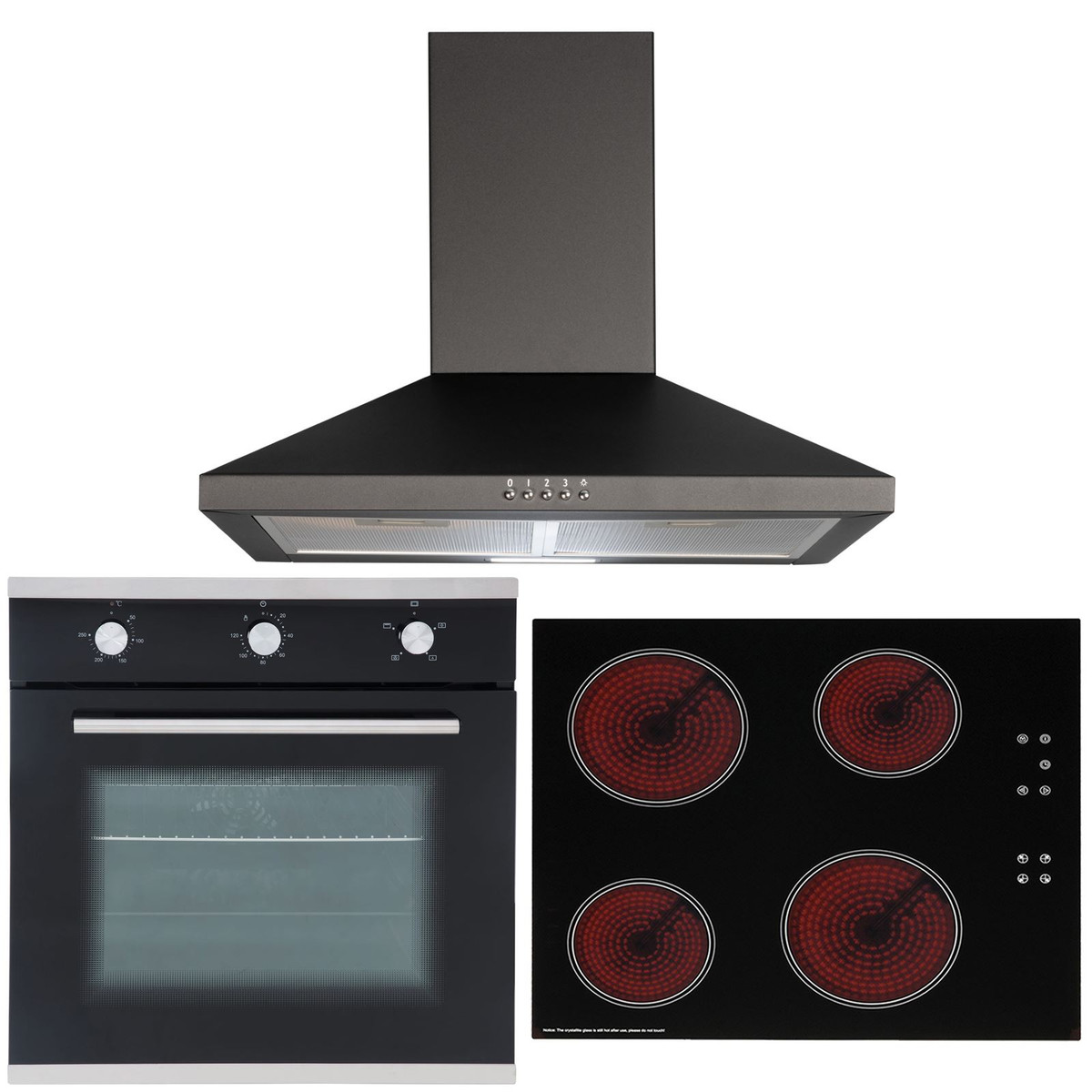 The SO101-CERH60BL-CHL60BL package includes a single true fan electric oven, 4 zone touch control ceramic hob and to match, a 60cm pyramid chimney cooker hood. The SO101 has an energy rating of 'A', which will consume less electricity and help keep your bills low. Having built-in safety features such as the child safety lock and residual heat indicators, the stunning hob with black safety glass is not only extremely durable and tough but also adds a modern look to any kitchen. The cooker hood is small but powerful helping you keep your kitchen clean and fresh and has a simplistic design that will fit in with your kitchens décor.