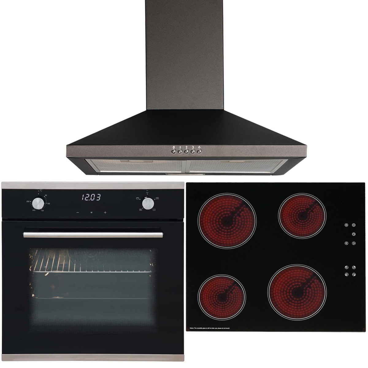 The SO103-CERH60BL-CHL60BL package includes a single touch control true fan oven, 4 zone touch control ceramic hob and a 60cm pyramid chimney cooker hood. The SO103 is a stylish yet functional, built-in single oven. With a modern black glass front and stainless steel accessories it will blend in with any kitchen's décor. It has the ability to be installed beneath a worktop or into a cupboard unit giving you flexibility and the soft touch controls make cooking quick and simple. The hob with it's built-in safety features such as the child safety lock and residual heat indicators, has black safety glass so is not only extremely durable and tough but also adds a modern look to any kitchen. The cooker hood is small but powerful helping you keep your kitchen clean and fresh and has a simplistic design that will fit in with your kitchens décor.