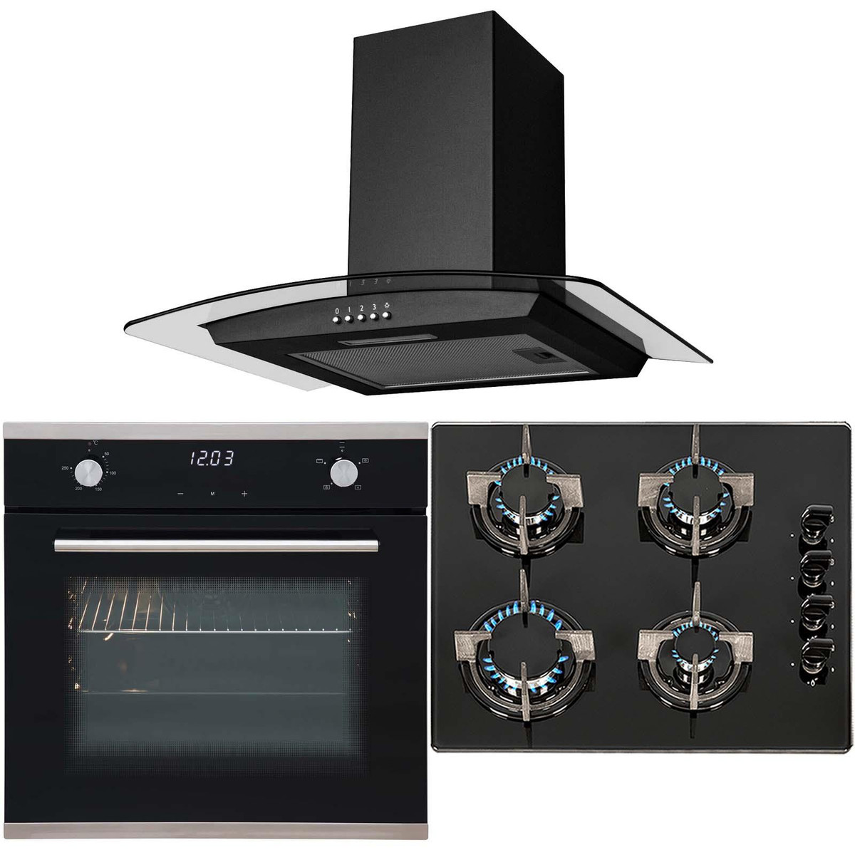 The SIA SO103-GHG602BL-CGH60BL pack includes a single touch control electric fan oven, 4 burner black gas on glass hob and a curved glass cooker hood. The oven has the ability to be installed beneath a worktop or into a cupboard unit giving you flexibility and the soft touch controls make cooking quick and simple. The hob has built-in safety features and an elegant design, the stunning black safety glass is not only extremely durable and tough but also adds a modern look to any kitchen. The cooker hood is small yet powerful helping you keep your kitchen clean and fresh and has a simplistic design that will fit in with your kitchens décor.