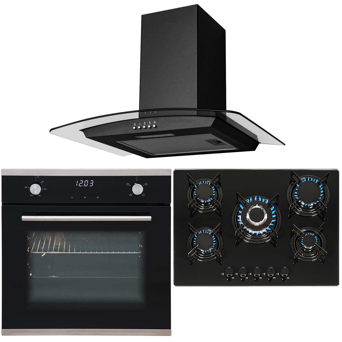 The SO103-GHG713BL-CGH70BL package contains a touch control single true fan oven, 70cm black 5 burner gas hob and curved glass cooker hood in black from SIA, our in-house range of un-branded kitchen appliances. The SO103 is a stylish yet functional, built-in or built-under multi-function electric oven with a digital display and timer. With it’s modern black glass front and stainless-steel accessories, it will blend in with any kitchen’s décor. The gas hob has an elegant glass design and built-in safety features. With removable pan stands for easy cleaning and a wok burner for high-intensity cooking this appliance is great for any household. The cooker hood is both stylish and functional, with 3 speed settings and a LED downlight this simplistic hood is perfect for any kitchen.