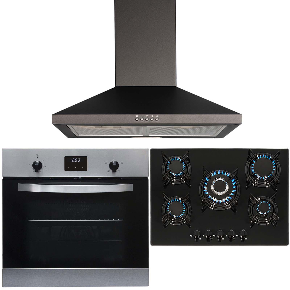 The SO112SS-GHG713BL-CHL70BL package contains a single true fan oven, 5 burner gas on glass hob and 70cm chimney cooker hood from SIA, our in-house range of un-branded kitchen appliances. The oven has a stylish black glass and stainless steel design and being a true fan oven means it will cook food quickly, evenly and efficiently to ensure creating tasty meals is a breeze! The hob has an elegant glass design and built-in safety features, with removable pan stands for easy cleaning and a wok burner for high-intensity cooking this appliance is perfect for any household. To complete this pack we have the 70cm chimney cooker hood with a powerful single fan motor and 3 variable speed settings for any type of cooking.