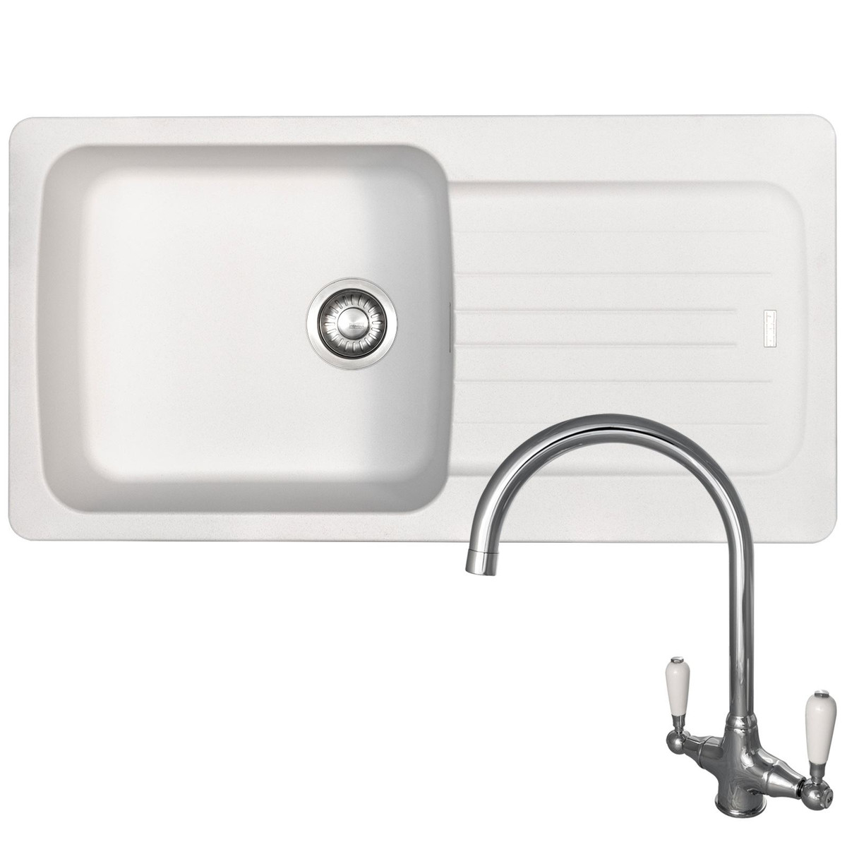The AVETA10ICE-Elbe pack comprises of a stunning Franke Tectonite sink and a Reginox Elbe swan neck dual lever tap. The sink is resistant to stains, scratches and heat and with a large single bowl is perfect in your kitchen or utility room. Tectonite is a revolutionary material that is as strong as granite without the heavy weight or brittleness. The sink is complemented by the Elbe tap that has white ceramic covered handles and shiny chrome finish that will add a contemporary look to any kitchen.