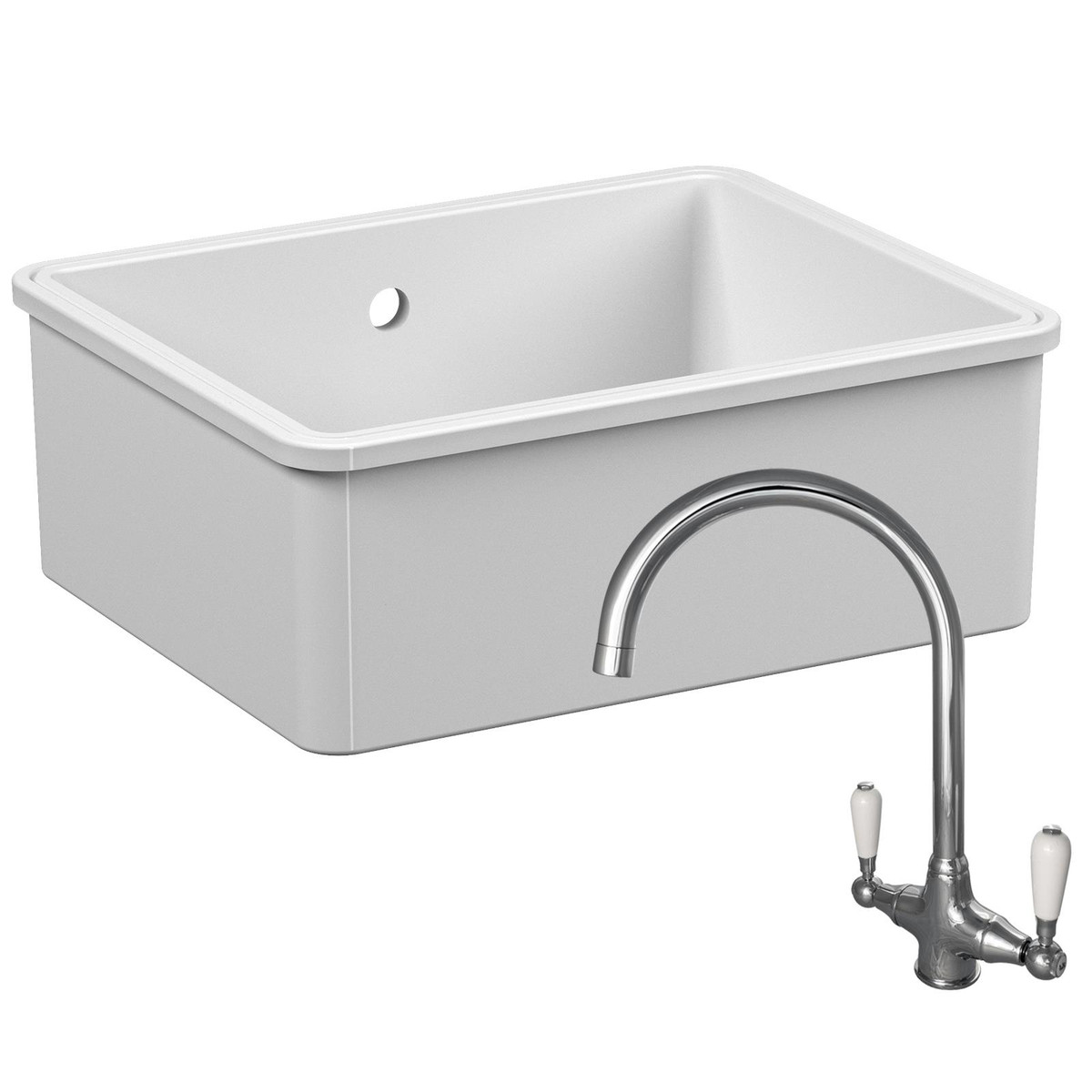 The Reginox Mataro is an elegantly designed, single bowl Fireclay ceramic sink, made using traditional methods that leave the sink with a high gloss finish. As an under-counter unit, the Mataro blends with your worktop leaving a clean integrated finish. Fireclay ceramic is renowned for being resistant to heat, fading and staining. In addition, due to their smooth, non-porous finish they are very easy to clean and maintain for years to come! Its large bowl will accommodate the washing up of even the largest families whilst taking up minimal space due to the lack of a draining board. This package comes with the Elbe, a twin lever swan neck tap with white ceramic handles that perfectly complements the sink.
