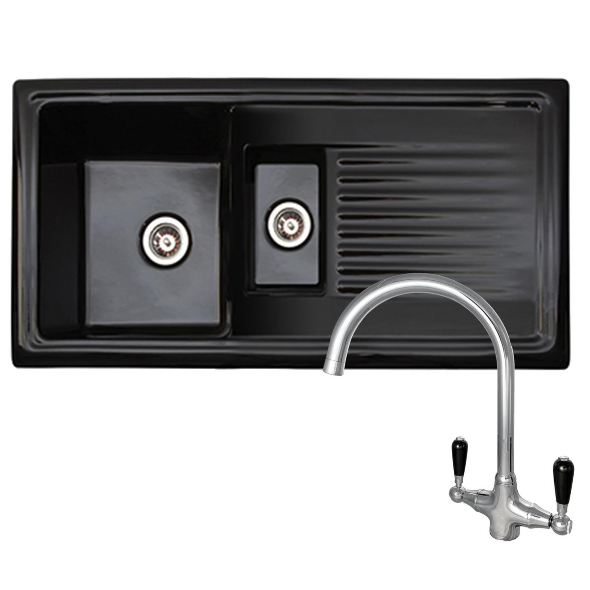 Reginox RL401CB 1.5 Bowl Black Gloss Ceramic Kitchen Sink With Waste & Fittings