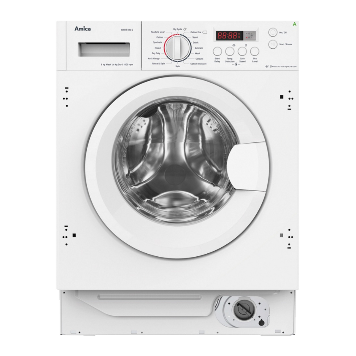 The Amica AWDT814S is a 8/6kg integrated washer dryer with a 1400rpm spin speed. It has a start delay timer and a safety key lock. It boasts 16 programmes including turbo wash and extra rinse and start delay, giving you ultimate washing and drying flexibility in one space without compromise.