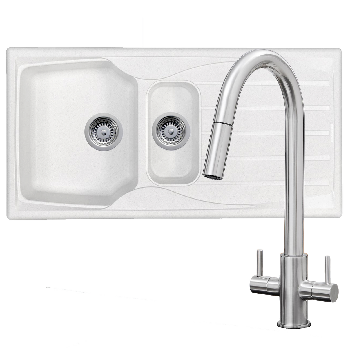 The Astracast Sierra range of fully reversible, composite sinks are high on quality but low on cost. They are manufactured from Teflite, a polypropylene material which is resistant to scratches, stains and heat. Not only are these sinks hard wearing, but they are also lightweight and can be installed on any work surface. This sink comes with a good sized main bowl and a smaller bowl that is useful for preparing fresh produce. Astracast are renowned globally for manufacturing high quality sinks and taps and this sink is no exception. The sink is complemented by the SIA KT4BN; a pull-out spray twin lever kitchen sink mixer tap with a brushed nickel finish that will add a modern look to any kitchen.