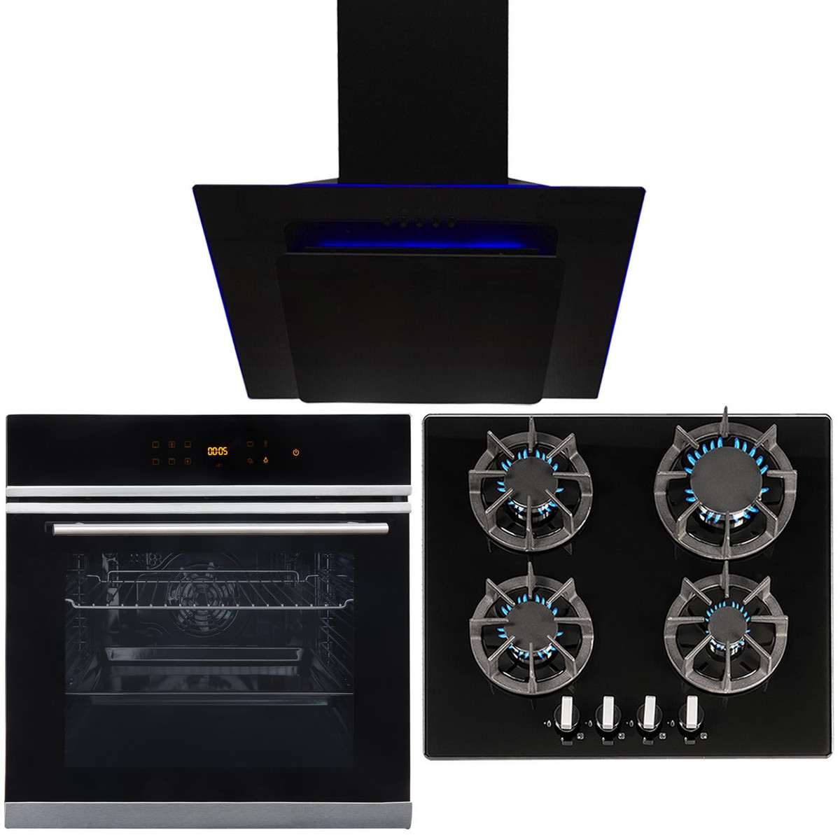 This 3-piece kitchen appliance pack combines stylish design with high functionality, making it the perfect set to revitalise any kitchen! The set comprises of a 10 function oven with a digital display, a black glass hob with 8-pronged pan stands and a multi-coloured LED cooker hood.