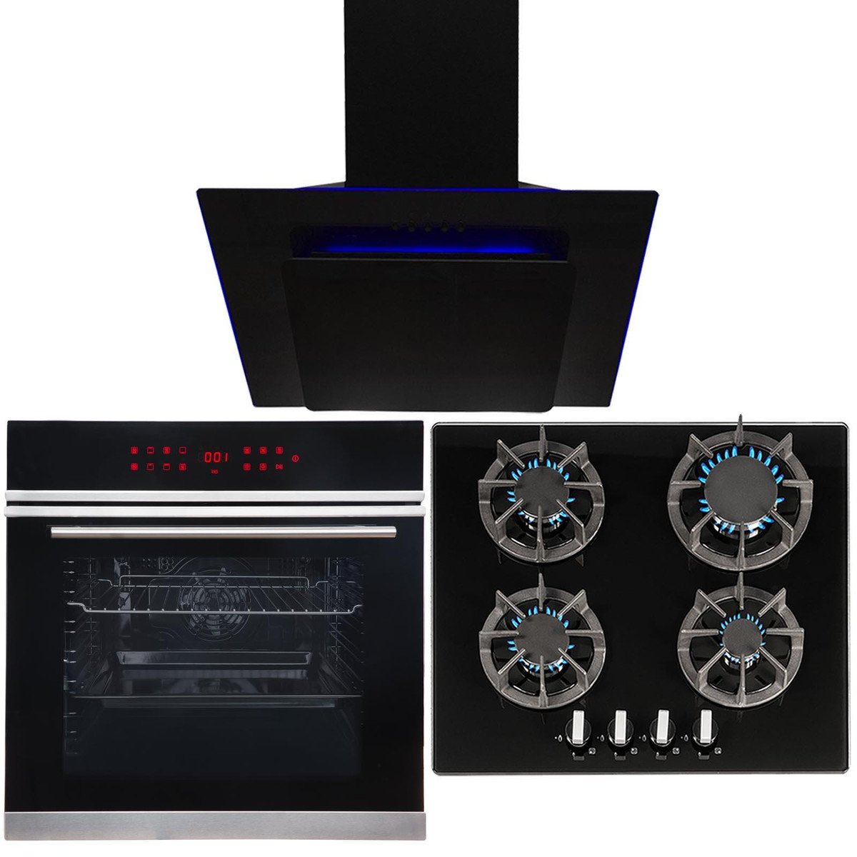 This 3-piece kitchen appliance pack combines stylish design with high functionality, making it the perfect set to revitalise any kitchen! The set comprises of a 13 function oven with a digital display, a black glass hob with 8-pronged pan stands and a multi-coloured LED cooker hood.