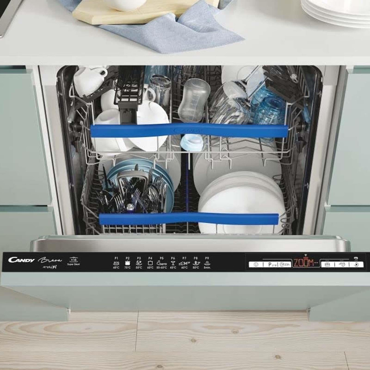 The Candy Brava CDIN 2D620PB-80E is a 60cm wide integrated dishwasher that is concealed neatly behind your kitchen cupboard door giving a seamless & stylish finish. This high spec up to date model has space for 16 place setting which is great for large households. It also has a bottom cutlery basket and additionally allows you enough space to separate your glassware from your crockery with it's height adjustable top basket with individual grooves for every item.