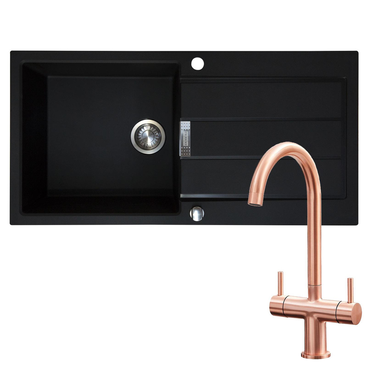 The Franke Sirius range is manufactured from Tectonite, a revolutionary composite material created by Franke, who continue to blend style with functionality. It has the strength and durability of granite without the heavyweight and brittleness, this means that this sink is suitable for almost any work surface. The inclusive pop-up strainer waste mechanism allows you to empty the bowl without having to reach to the bottom of the sink. The sink is complemented by the SIA KT3CU, a twin lever monobloc kitchen mixer tap with a modern design and a copper finish that will add a contemporary look to any kitchen.
