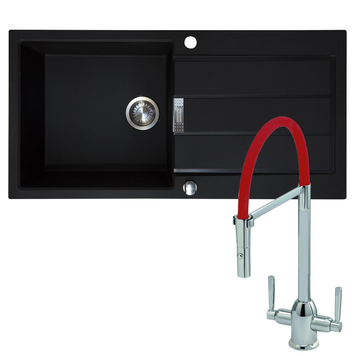 The Franke Sirius range is manufactured from Tectonite, a revolutionary composite material created by Franke, who continue to blend style with functionality. It has the strength and durability of granite without the heavyweight and brittleness, this means that this sink is suitable for almost any work surface. The inclusive pop-up strainer waste mechanism allows you to empty the bowl without having to reach to the bottom of the sink. The sink is complemented by the Carron Phoenix Dante, a chrome mixer tap with a vibrant red silicone hose that will add a splash of colour to any kitchen.