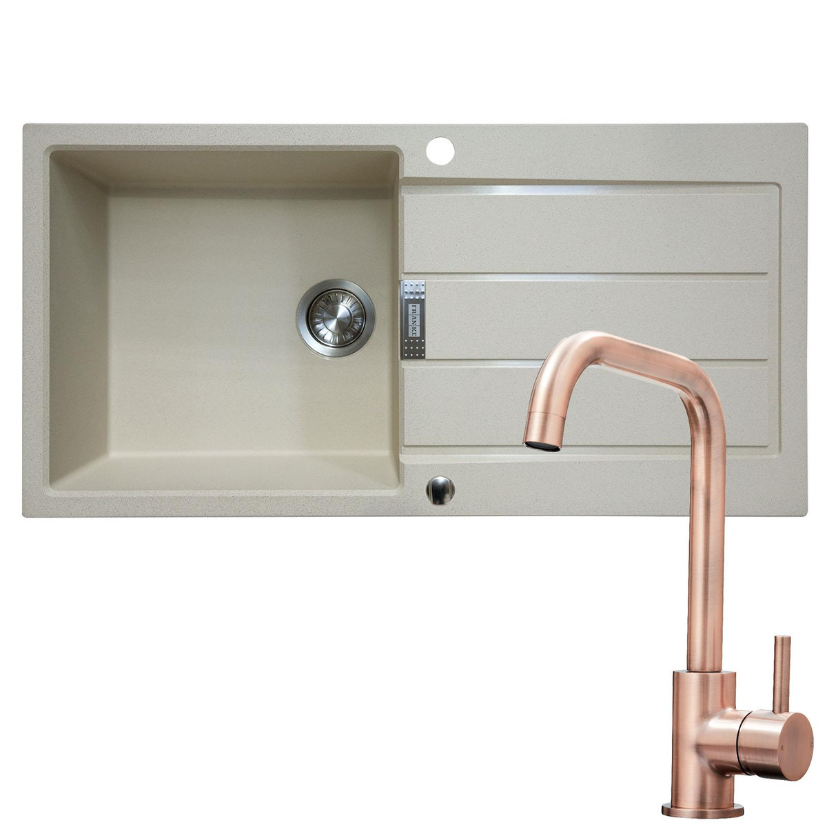 The Franke Sirius range is manufactured from Tectonite, a revolutionary composite material created by Franke, who continue to blend style with functionality. It has the strength and durability of granite without the heavyweight and brittleness, this means that this sink is suitable for almost any work surface. The inclusive pop-up strainer waste mechanism allows you to empty the bowl without having to reach to the bottom of the sink. The sink is complemented by the SIA KT6CUD, a single lever monobloc kitchen mixer tap with a modern design and a copper finish that will add a contemporary look to any kitchen.