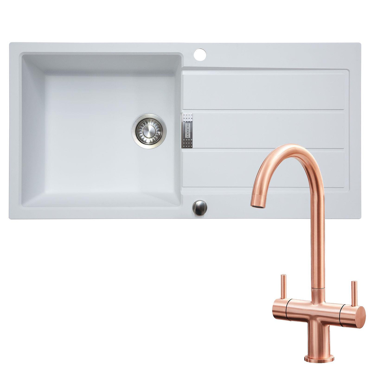 The Franke Sirius range is manufactured from Tectonite, a revolutionary composite material created by Franke, who continue to blend style with functionality. It has the strength and durability of granite without the heavyweight and brittleness, this means that this sink is suitable for almost any work surface. The inclusive pop-up strainer waste mechanism allows you to empty the bowl without having to reach to the bottom of the sink. The sink is complemented by the SIA KT3CU, a twin lever monobloc kitchen mixer tap with a modern design and a copper finish that will add a contemporary look to any kitchen.