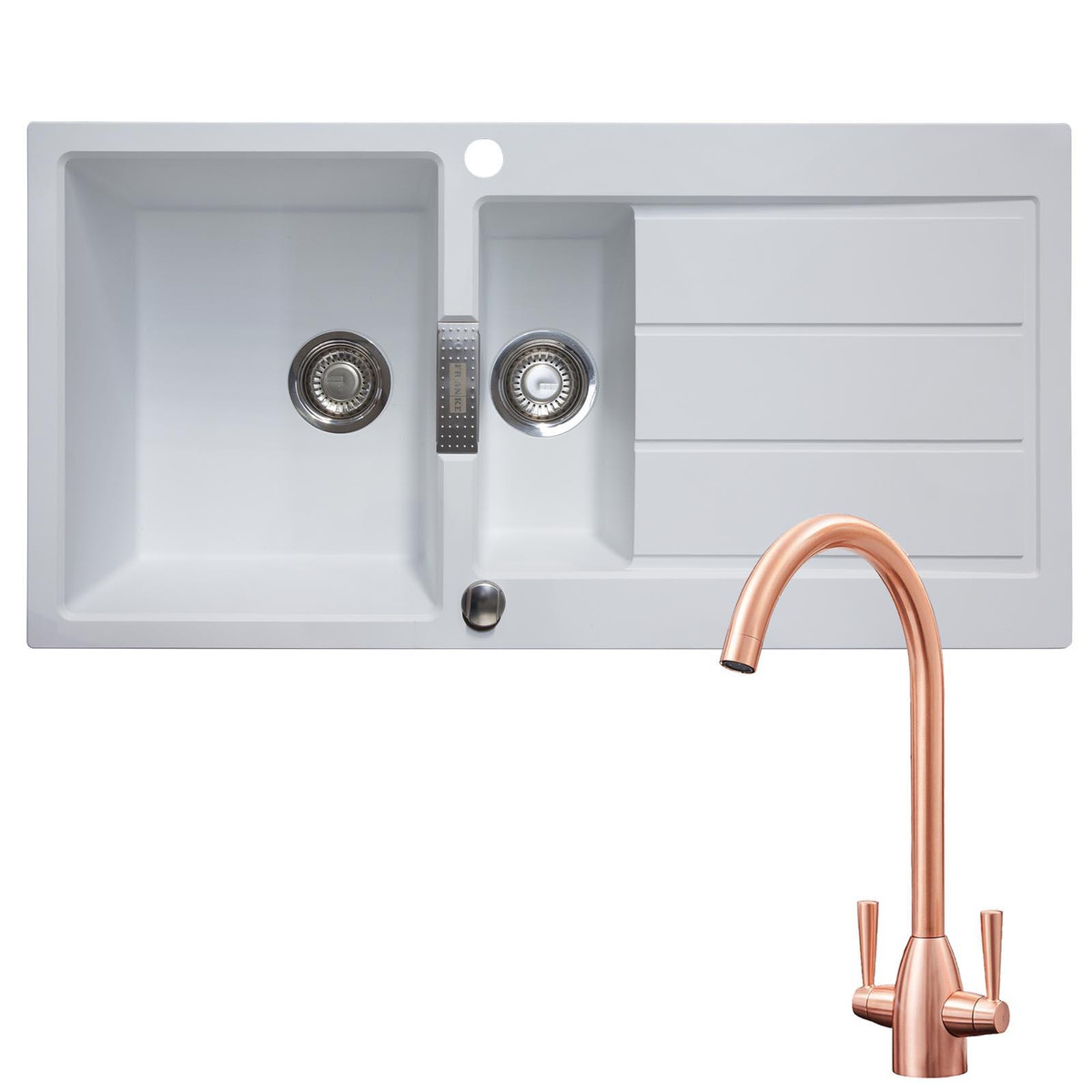 The S2D651PW-KT5CU pack consists of a 1.5 bowl white tectonite reversible kitchen sink and a SIA KT5CU mixer tap. The sink is manufactured from Tectonite, a revolutionary composite material that has the strength and durability of granite, without the heavyweight and brittleness. Franke is a leading expert in producing high-quality kitchen appliances and they continue to blend style with functionality in all of their sinks. This package comes with the SIA KT5CU twin lever mixer tap which has a stylish copper finish that complements the sink perfectly.