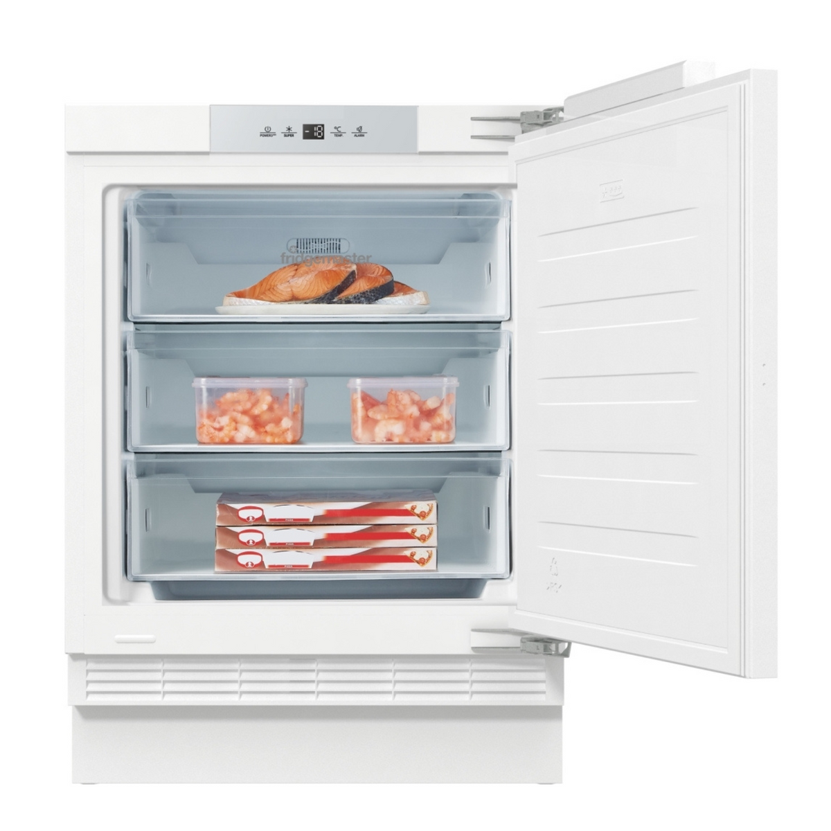 Introducing the MBUZ6097E Integrated Under Counter Freezer from Fridgemaster with an internal LED light and 3 food storage compartments. The electronic temperature controls allow you to easily change and monitor the internal temperature. Plus, there's no need to stress if there's a power cut as the power failure safe function will keep everything cold for up to 14 hours.