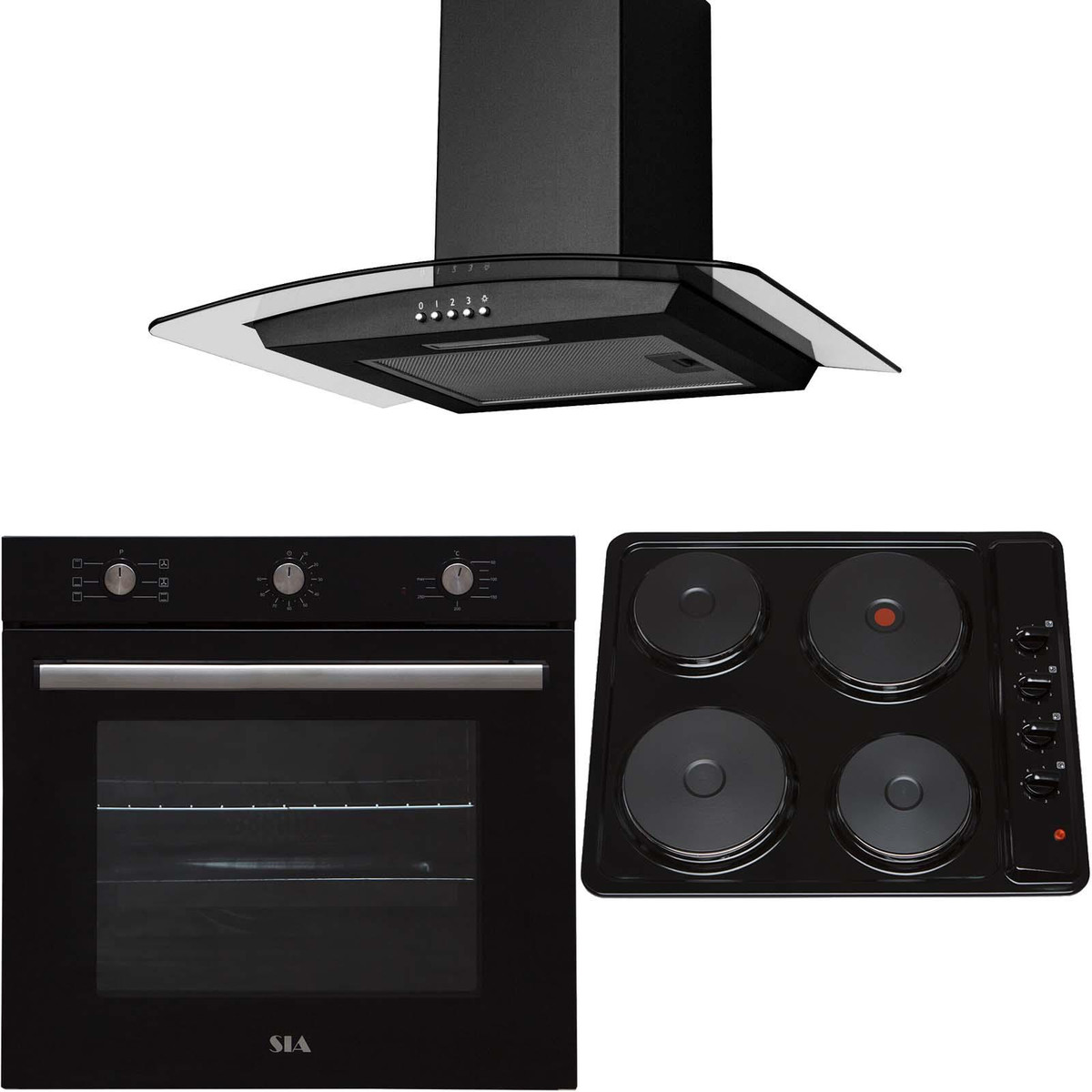 The FSO10BL-PHP601BL-CGH60BL pack from SIA is a stylish yet functional, built-in single oven, 4 zone electric solid plate hob and curved glass chimney cooker hood. The simple dial controls make using the appliances a piece of cake and the built-in oven can be mounted under a worktop or at eye level, so it can match any kitchen style. These appliances have been chosen to complement each others design and fit into any modern kitchen.