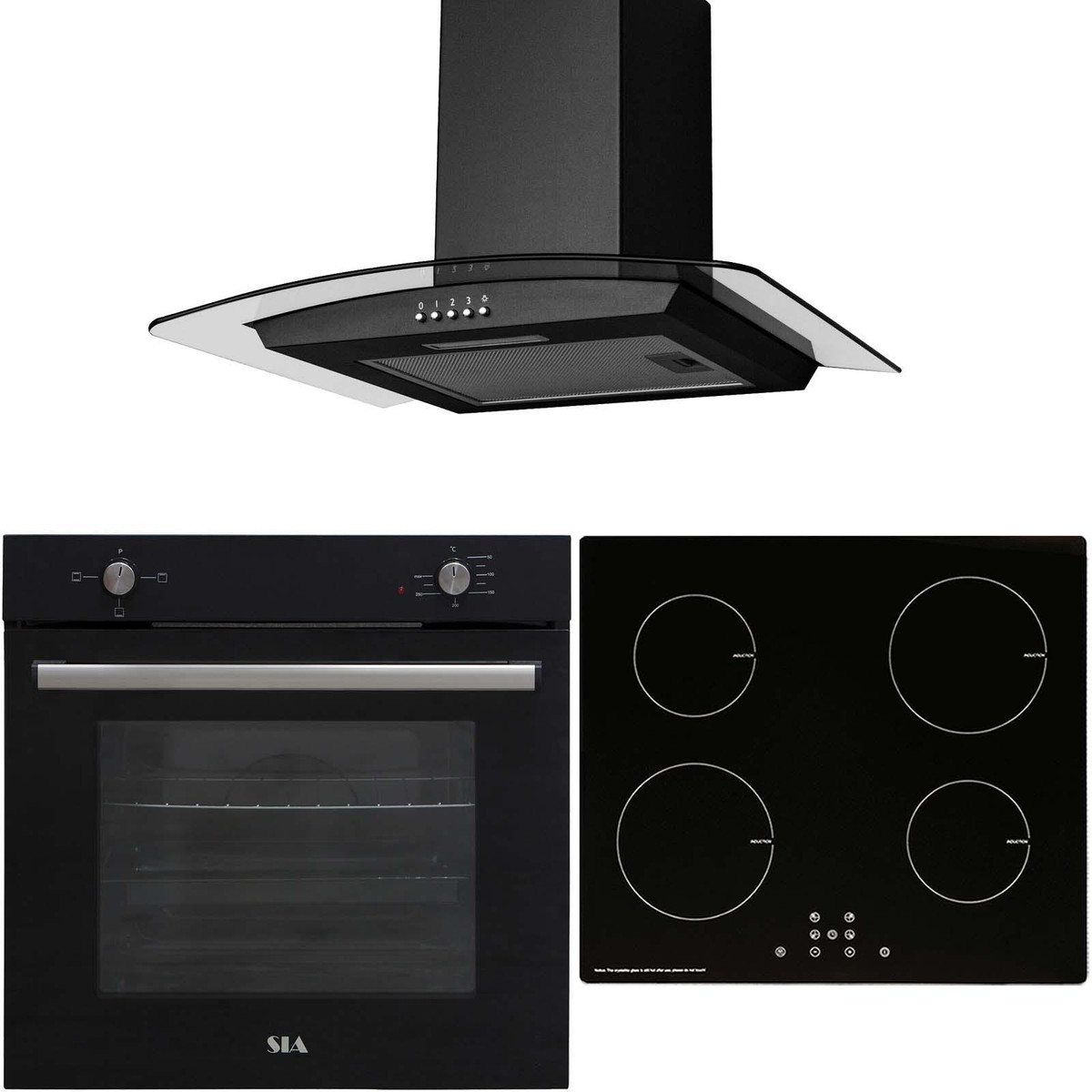 The SSO10BL-INDH60BL-CGH60BL package includes a single electric oven, 4 zone induction hob and a 60cm curved glass chimney cooker hood. The simple dial controls make using the oven a piece of cake and it can be mounted under a worktop or at eye level, so it can match any kitchen style. The hob and cooker hood complete this set with matching brushed steel finishes that will revitalise any kitchen!