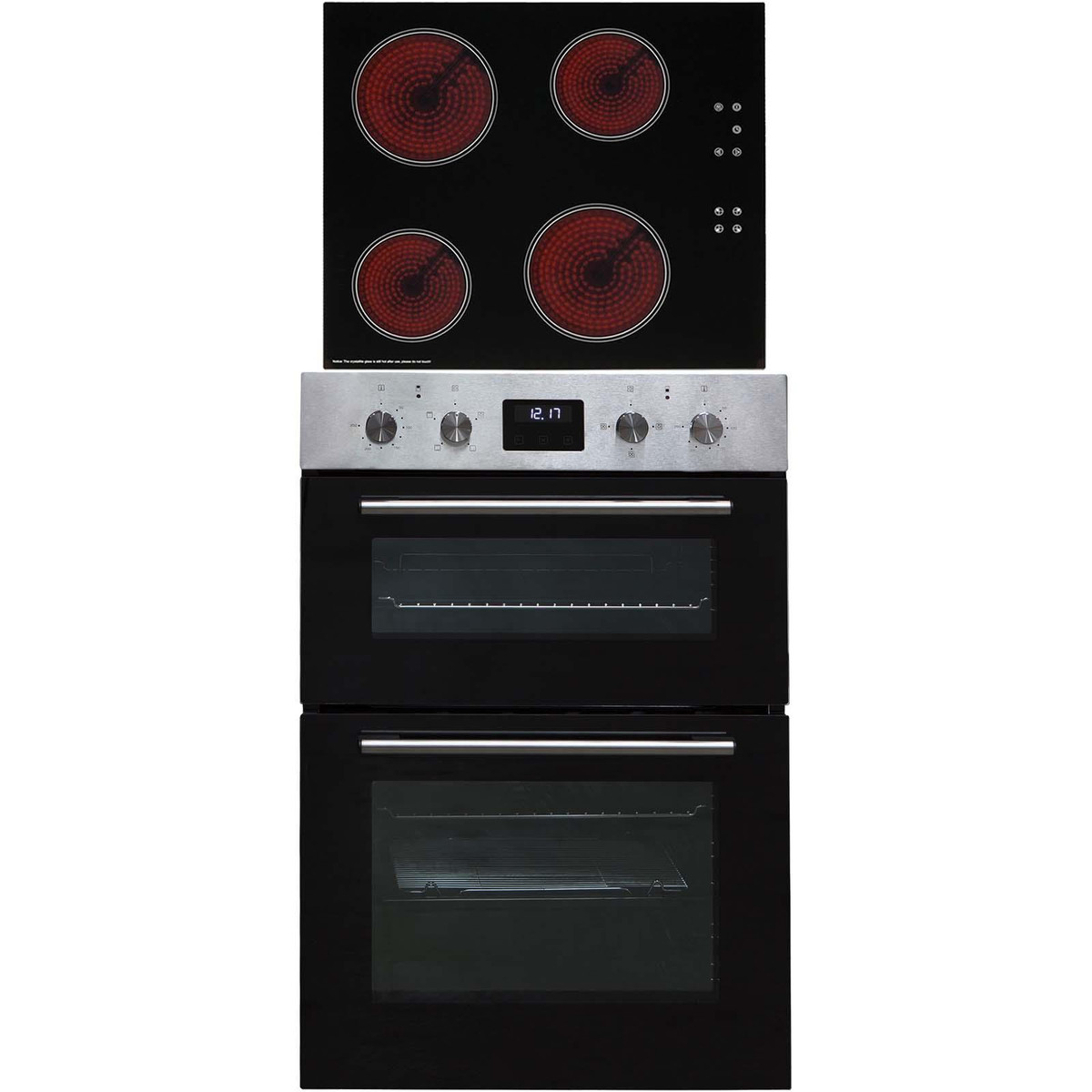 The SIA DO112SS-CERH60BL is a stylish yet functional, built-in double oven and 4 zone ceramic hob. With a modern black glass front and stainless steel trim it will blend in with any kitchens décor. The bottom oven features a fanned circular heater which provides quick and efficient cooking and the top oven can be used as a convection oven or grill, providing a use for any type of dish!