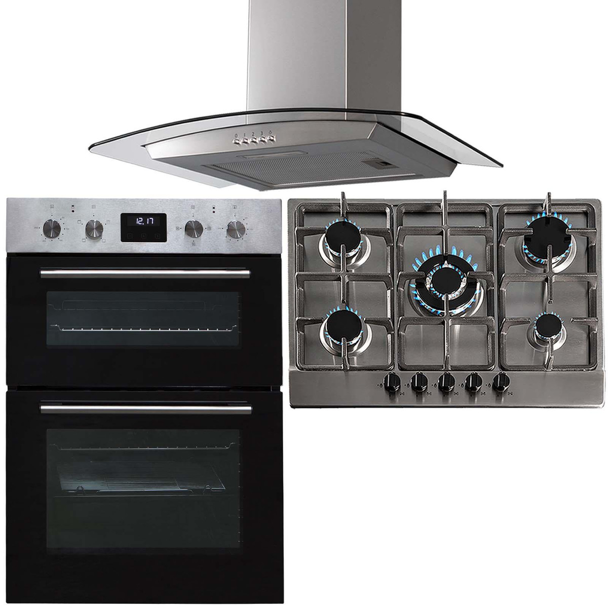 The SIA DO112SS-SSG701SS-CGH70SS is a stylish yet functional, built-in double oven, 5 burner gas hob and curved glass cooker hood. The oven has a modern black glass front and stainless steel trim it will blend in with any kitchens décor. The bottom oven features a fanned circular heater which provides quick and efficient cooking and the top oven can be used as a convection oven or grill, providing a use for any type of dish!