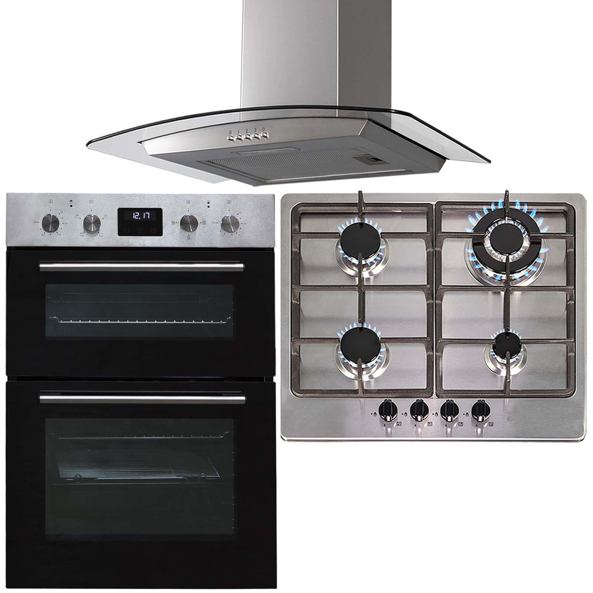 The SIA DO112SS-SSG601SS-CGH60SS is a stylish yet functional, built-in double oven, 4 burner gas hob and curved glass cooker hood. The oven has a modern black glass front and stainless steel trim it will blend in with any kitchens décor. The bottom oven features a fanned circular heater which provides quick and efficient cooking and the top oven can be used as a convection oven or grill, providing a use for any type of dish!