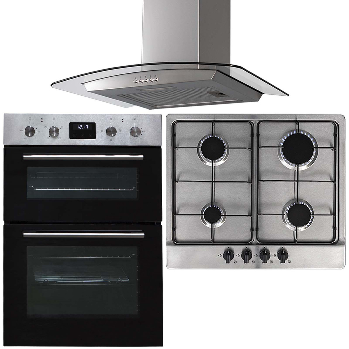 The SIA DO112SS-SSG602SS-CGH60SS is a stylish yet functional, built-in double oven, 4 gas burner hob and curved glass cooker hood. The oven has a modern black glass front and stainless steel trim it will blend in with any kitchens décor. The bottom oven features a fanned circular heater which provides quick and efficient cooking and the top oven can be used as a convection oven or grill, providing a use for any type of dish!