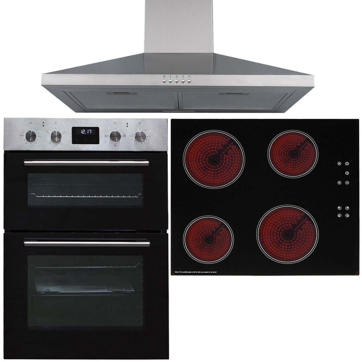 The SIA DO112SS-CERH60BL-CHL60SS is a stylish yet functional, built-in double oven, 4 zone ceramic hob and chimney cooker hood. With a modern black glass front and stainless steel trim it will blend in with any kitchen décor. The bottom oven features a fanned circular heater which provides quick and efficient cooking and the top oven can be used as a convection oven or grill, providing a use for any type of dish!