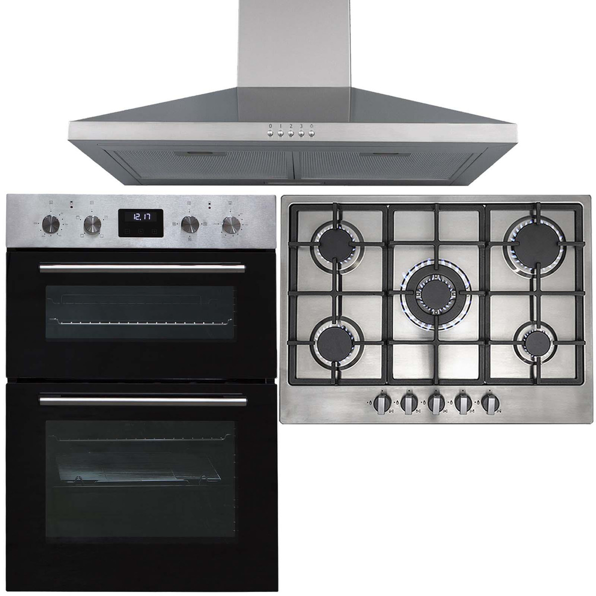 The SIA DO112SS-R6-CHL70SS is a stylish yet functional, built-in double oven, 5 burner gas hob and chimney cooker hood. The oven has a modern black glass front and stainless steel trim it will blend in with any kitchens décor. The bottom oven features a fanned circular heater which provides quick and efficient cooking and the top oven can be used as a convection oven or grill, providing a use for any type of dish!