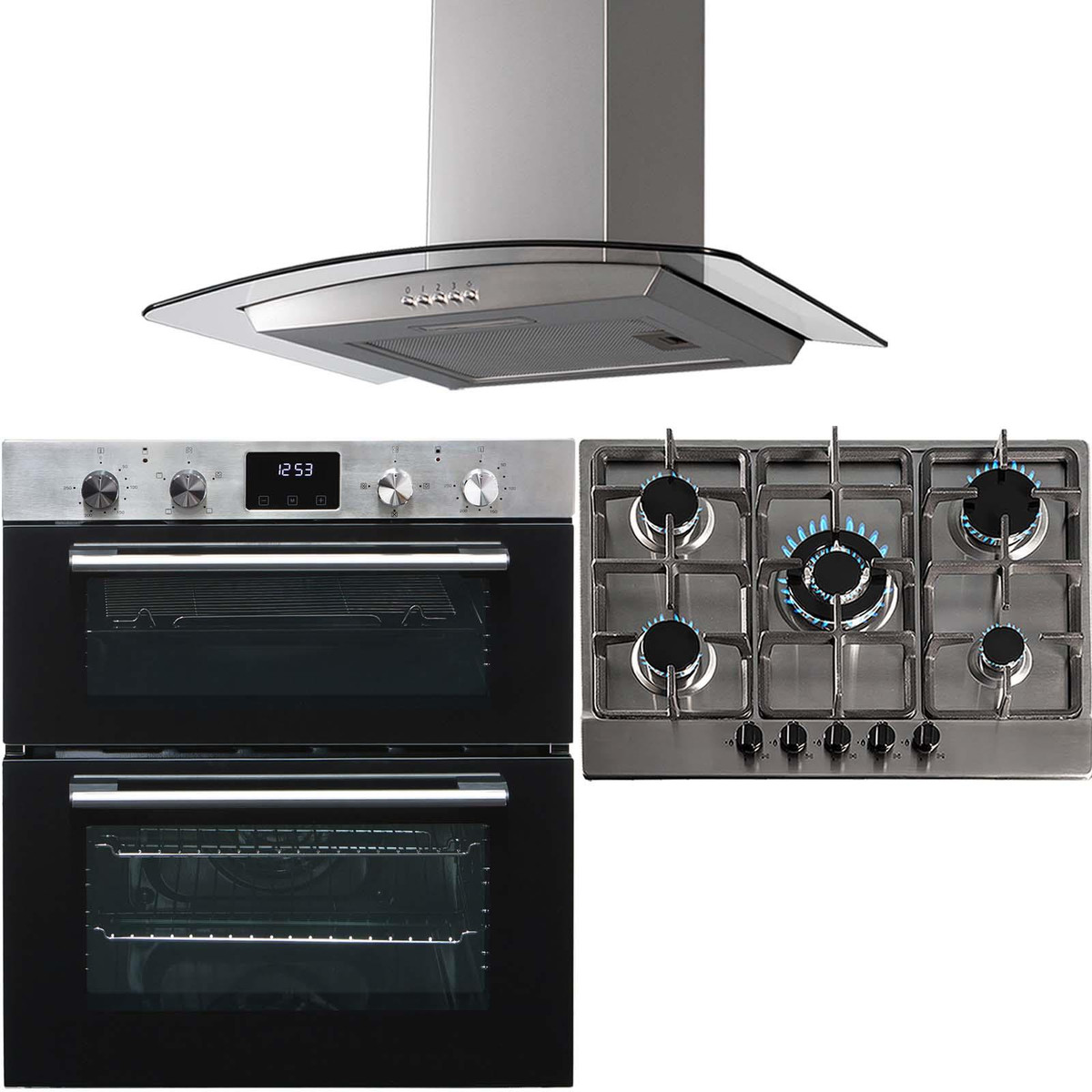 The DO111SS-SSG701SS-CGH70SS is a stylish built-under double oven, 5 burner gas hob and curved cooker hood. The oven has a modern black glass front and stainless steel trim it will blend in with any kitchen décor. The bottom oven features a fanned circular heater which provides quick and efficient cooking and the top oven can be used as a convection oven or grill, providing a use for any type of dish!