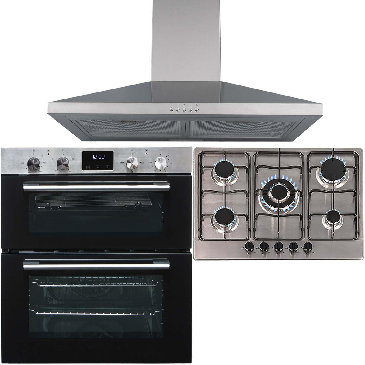 The DO111SS-SSG702SS-CHL70SS is a stylish built-under double oven, 5 burner gas hob and chimney hood. The oven has a modern black glass front and stainless steel trim it will blend in with any kitchen décor. The bottom oven features a fanned circular heater which provides quick and efficient cooking and the top oven can be used as a convection oven or grill, providing a use for any type of dish!