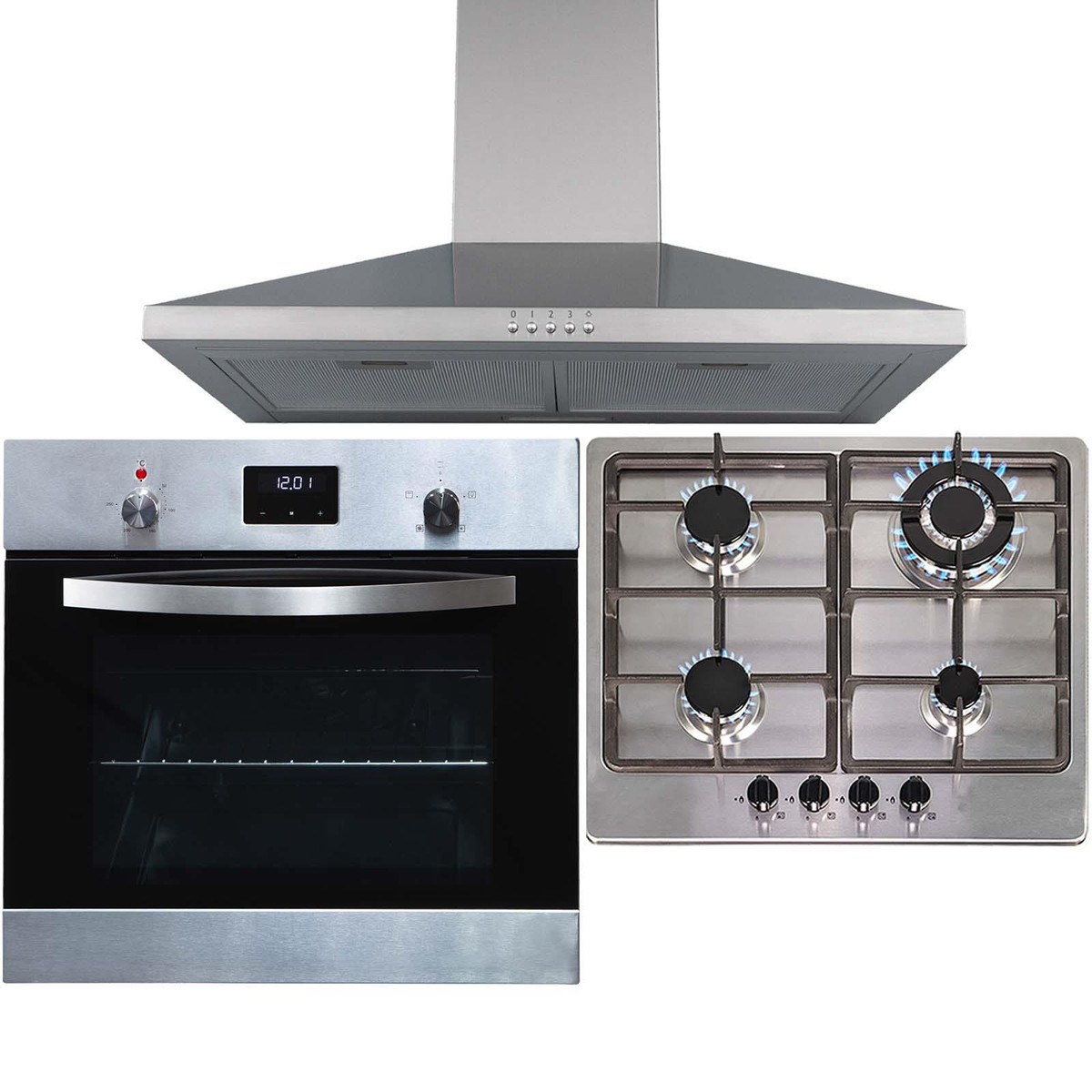 The SO114SS-SSG601SS-CHL60SS package contains a stainless steel single electric oven, a 4 burner gas hob and cooker hood. This set is packed with features and style, that is sure to revitalise any kitchen!