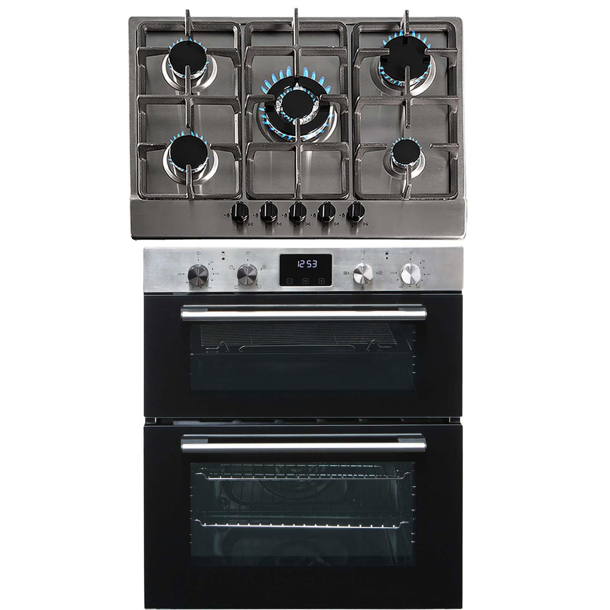 The DO111SS-SSG701SS is a stylish built-under double oven and 5 burner gas hob. The oven has a modern black glass front and stainless steel trim so it will blend in with any kitchens décor. The bottom oven features a fanned circular heater which provides quick and efficient cooking and the top oven can be used as a convection oven or grill, providing a use for any type of dish!