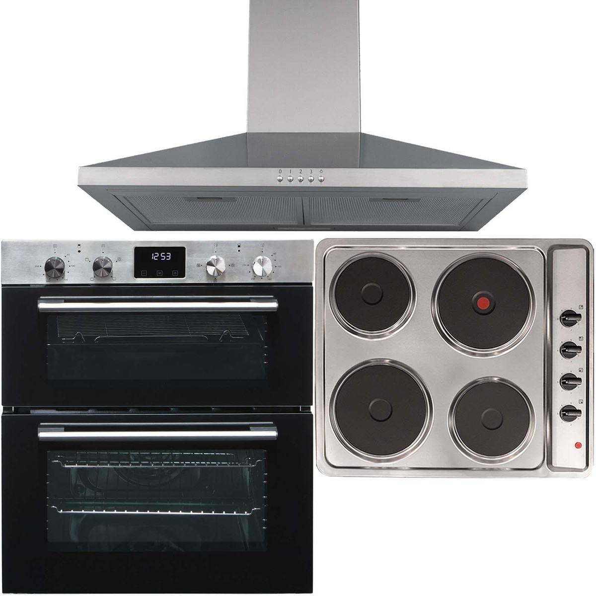 The DO111SS-PHP601SS-CHL60SS is a stylish built-under double oven, 4 zone solid plate hob & cooker hood. The oven has a modern black glass front and stainless steel trim it will blend in with any kitchen décor. The bottom oven features a fanned circular heater which provides quick and efficient cooking and the top oven can be used as a convection oven or grill, providing a use for any type of dish!