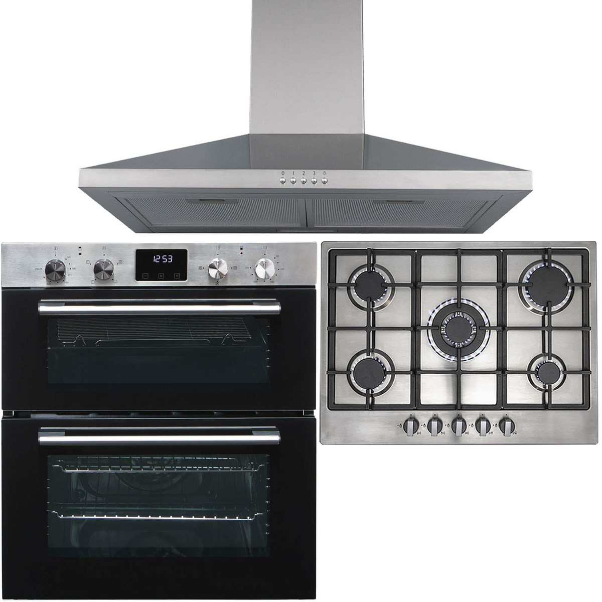 The DO111SS-R6-CHL70SS is a stylish built-under double oven, 5 burner gas hob and cooker hood package. The oven has a modern black glass front and stainless steel trim it will blend in with any kitchen décor. The bottom oven features a fanned circular heater which provides quick and efficient cooking and the top oven can be used as a convection oven or grill, providing a use for any type of dish!