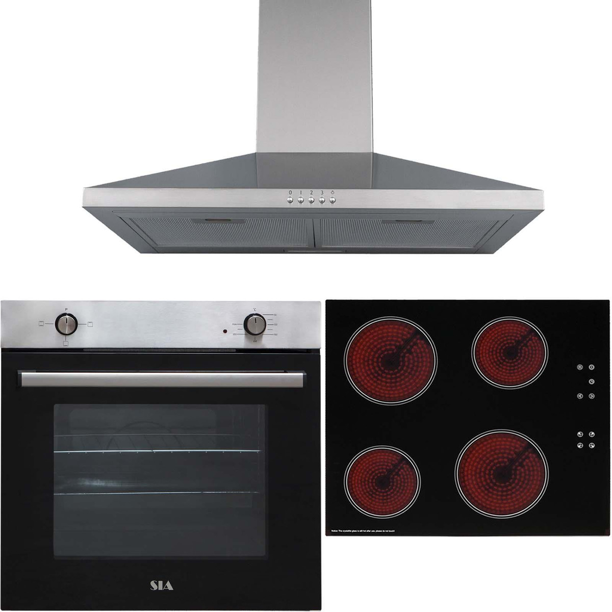 The SSO10SS-CERH60BL-CHL60SS pack from SIA is a stylish yet functional, built-in single oven, 4 zone electric ceramic hob and chimney cooker hood. The simple dial controls make using the oven a piece of cake and it can be mounted under a worktop or at eye level, so it can match any kitchen style. These appliances have been chosen to complement each others design and fit into any modern kitchen.