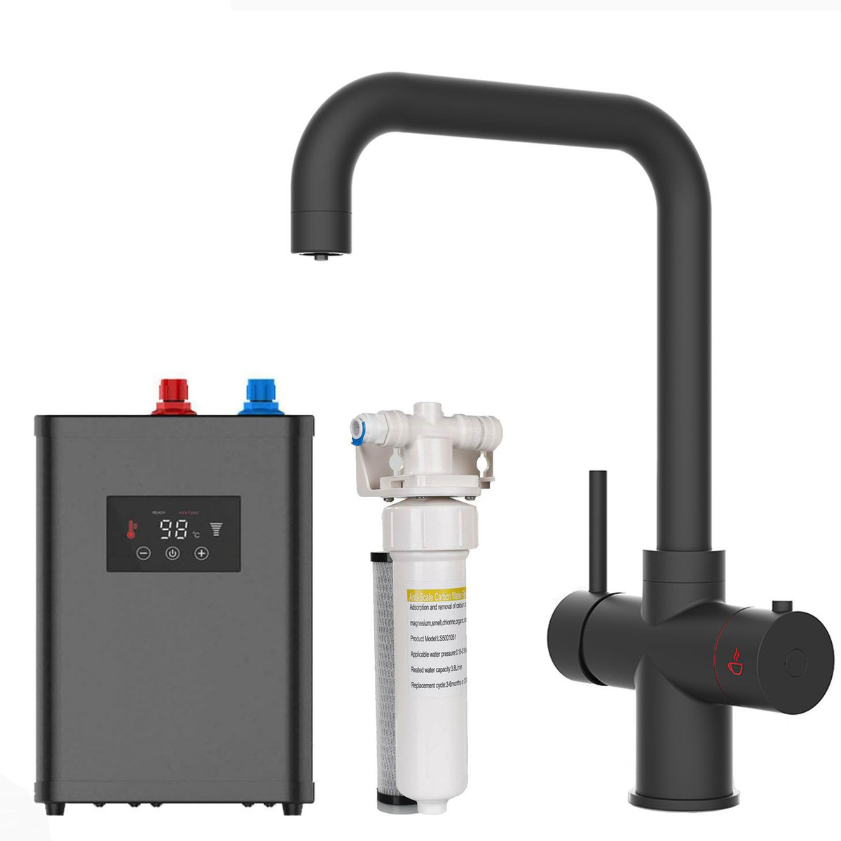 The tap comes with a nano-phosphate filter and an in-cupboard fully insulated storage tank. The filter purifies water before it gets to the tank, which removes any impurities and helps to improve the water’s taste & clarity. The 2.4L water tank keeps hot water stored and ready to pour, using less electricity compared to boiling your average kettle a few times a day, ensuring your energy bills remain as low as possible. The touch control tank has 9 different temperature settings ranging from 55-98°C so you can set the perfect temperature for your needs.