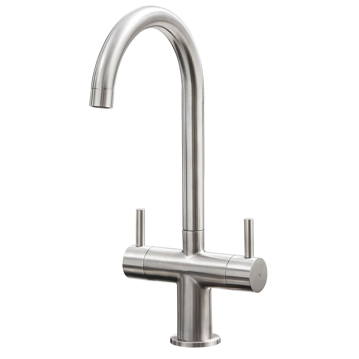 The SIA KT3BN is a swan neck kitchen mixer tap with a contemporary look that will add a touch of style to any kitchen. The brushed nickel finish gives the tap an ultra modern look, allowing it to match perfectly with any type of sink. The two quarter turn levers allow for precise water flow and the swivel spout means it is perfect for sinks with multiple bowls.