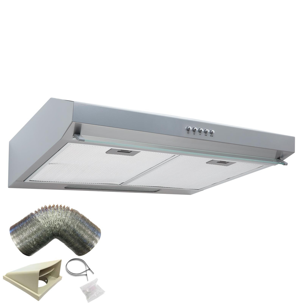 This cooker hood comes with the SIA D1 125mm x 1m ducting kit, so you have everything you need to set it up for external extraction. The ducting kit is used to channel odours, steam and smoke straight outside, keeping your kitchen clean and fresh. The appliance can be used for internal re-circulation however carbon filters would need to be purchased separately.
