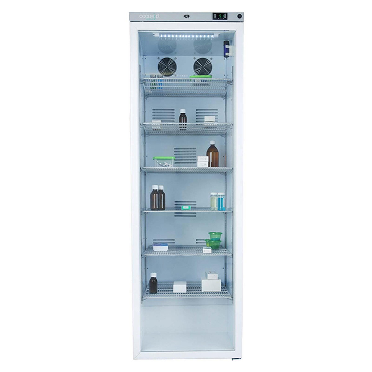 This model has a net capacity of 400L and is fitted with 2 cooling fans, to ensure stability of temperature from top to bottom. It defrosts automatically and is fitted with a 2m plug for ease of installation. The temperature range is from 2-8°C and is stabilised by our high quality temperature sensor, which keeps the internal temperature even and stable. The fridge records minimum and maximum temperatures when plugged into the power source, but will continue to operate if this fails by running on the batteries installed in the panel on the side of the cabinet.